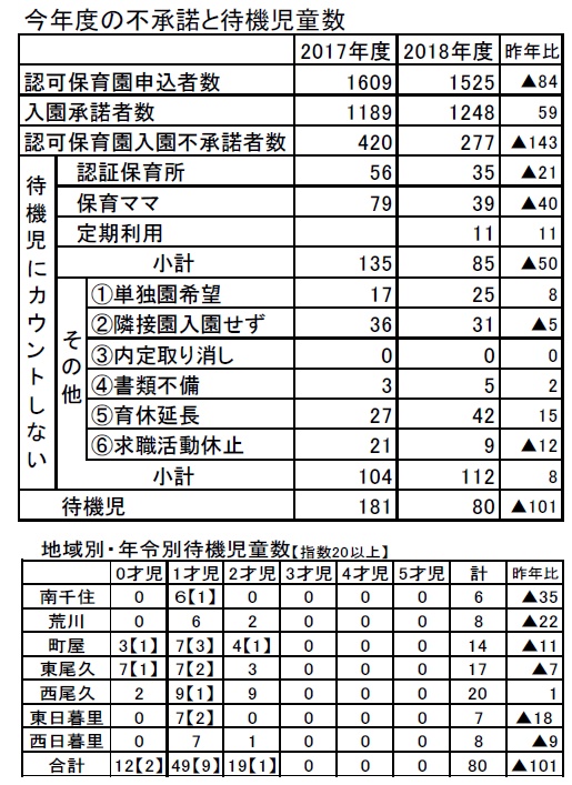 保育園新規開園(4園272定員一部6月受入)や入園申込みが84名減って、認可保育園入園不承諾者数は昨年より143名減少しました。しかし、認証保育園や保育ママなどを除けば192名が保育サービスを受けられませんでした。