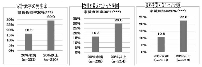 分析では(小学5年の世帯年)収入と社会保障給付の合計額に対する家賃割合=負担率は、生活困窮層では家賃負担率が40%以上の世帯が35・4%(下左表参照)。これが、家計を圧迫、預貯金の取り崩しや借金に頼る原因となり、必要な衣類が買えない、食料の購入が困難などが生じ、子どもたちに健康はじめ大きなリスクとなっています(下グラフ参照)。小田川教授「子どもたちの生活が過度な家賃負担により制約されないよう、家賃負担軽減や、公営住宅への優先入居」など施策充実を提案しています。