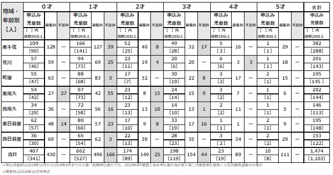 新年度4月開設(町屋2丁目60人定員、西日暮里6丁目60人定員)の私立保育園2園、元東日暮里保育園の移転定数拡大などで保育園定数は増えました。その結果、0才児は全体での不足数はありませんが、地域的には東尾久・東西日暮里で不足枠が生じています。