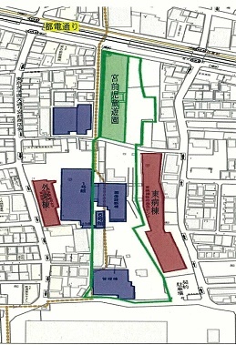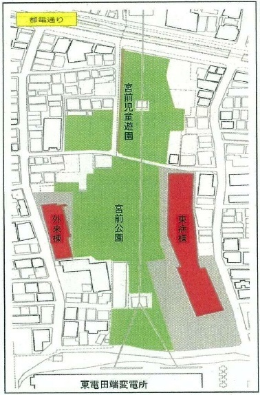 ※左図が移転後で、赤の部分が病院建物、緑の部分は公園として整備 右図は現在