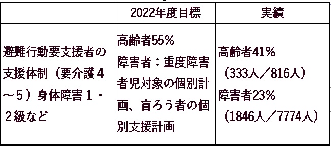避難行動要支援者(上表)のうち個別支援画策定は、高齢者41%、障害者23%に止まっています。福祉の充実こそ、命を守ることにつながります。
