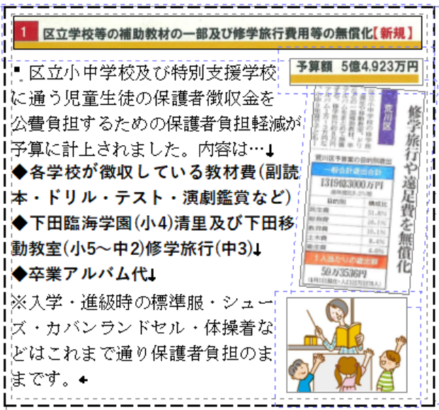 滝口区政最初の予算案は、総額1319億円規模、当初予算で過去最高となりました。この中では、「区立学校等の補助教材の一部及び修学旅行費用など無償化」(左囲み)が新規事業として計上されました。これは、給食無償化に続き、子育て世帯の負担軽減と義務教育の完全無償化への大きな一歩となるものです。