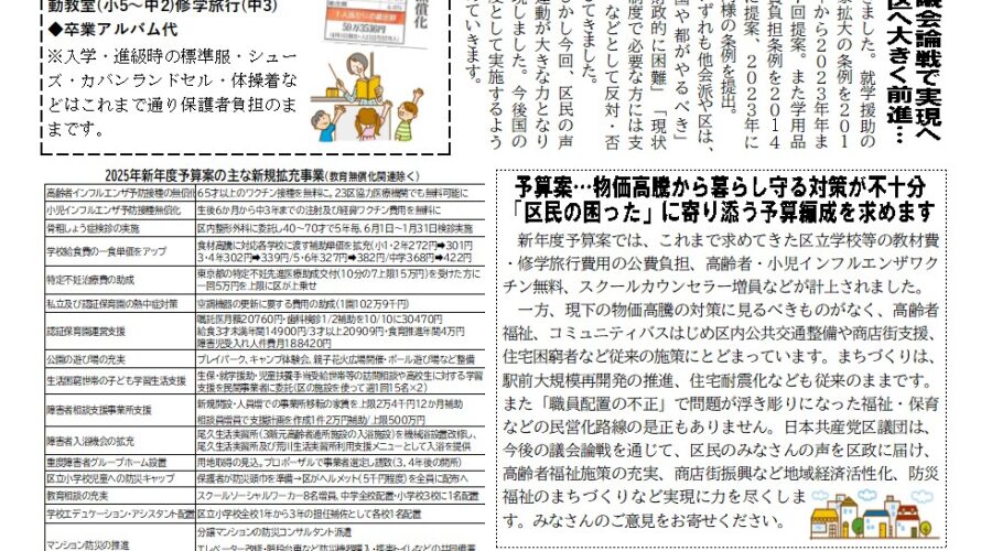 区民の声・運動と結んだ議会論戦で実現へ 子育ての負担ゼロの荒川区へ大きく前進… 滝口区政最初の予算案は、総額1319億円規模、当初予算で過去最高となりました。この中では、「区立学校等の補助教材の一部及び修学旅行費用など無償化」(左囲み)が新規事業として計上されました。これは、給食無償化に続き、子育て世帯の負担軽減と義務教育の完全無償化への大きな一歩となるものです。 日本共産党区議団の提案と取り組み […]
